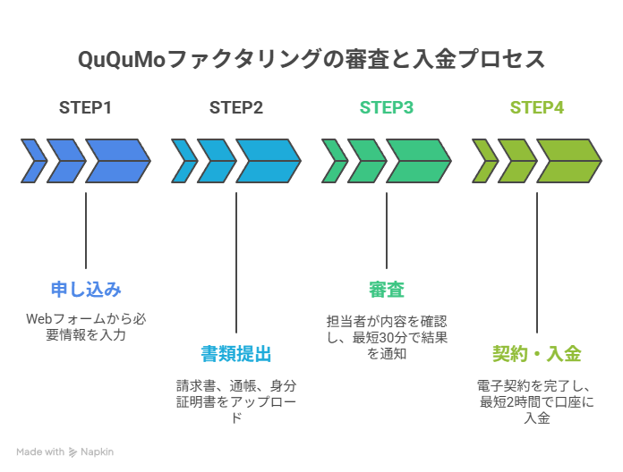 QuQuMo(ククモ)は 「スピード」と「利便性」に非常に強いサービス です。特にフリーランスや小規模事業者にとって、スマホだけで完結し最短2時間で入金される点は大きな安心材料となります。 一方で、利用できる金額は小口中心であり、大口資金の調達や柔軟な審査を求めるケースでは物足りなさが残ります。 総合すると、「急ぎで少額を資金化したいユーザー」には最適なサービス と言えますが、数百万円単位の資金ニーズや長期的な信頼性を重視する場合は、ビートレーディングなどの大手と併せて比較検討するのが安心です。📝 QuQuMo(ククモ)の審査の流れ